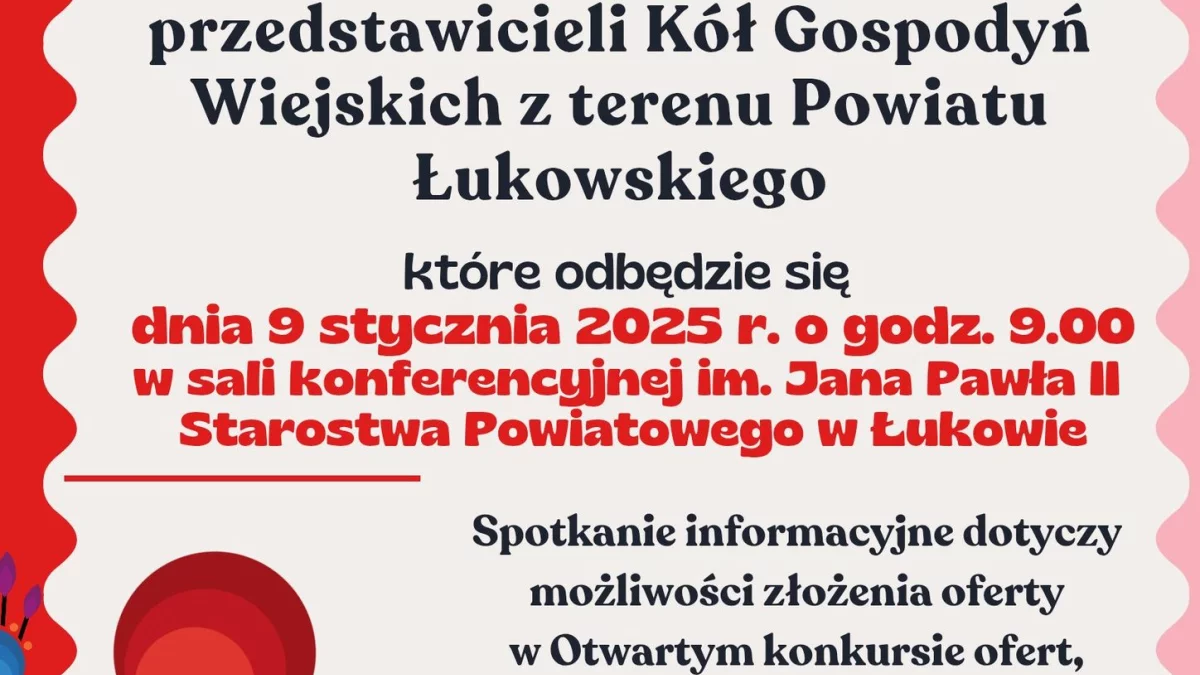 Spotkanie informacyjne dotyczy możliwości złożenia oferty w Otwartym konkursie ofert, ogłoszonym przez Zarząd Powiatu Łukowskiego na zadanie w zakresie pielęgnowania tradycji i zwyczajów przez Koła Gospodyń Wiejskich oraz ich realizację w 2025 r. W roku 2025 Koła Gospodyń Wiejskich będą mogły przystąpić do otwartego konkurs ofert ogłaszanego przez Zarząd Powiatu Łukowskiego na realizację zadań publicznych w zakresie kultury, sztuki, ochrony dóbr kultury i dziedzictwa narodowego na zadanie pn. Zadanie w zakresie pielęgnowania tradycji i zwyczajów przez Koła Gospodyń Wiejskich. Dlatego też zapraszamy przedstawicieli Kół Gospodyń Wiejskich z terenu Powiatu Łukowskiego na spotkanie informacyjne, dotyczące składania ofert.