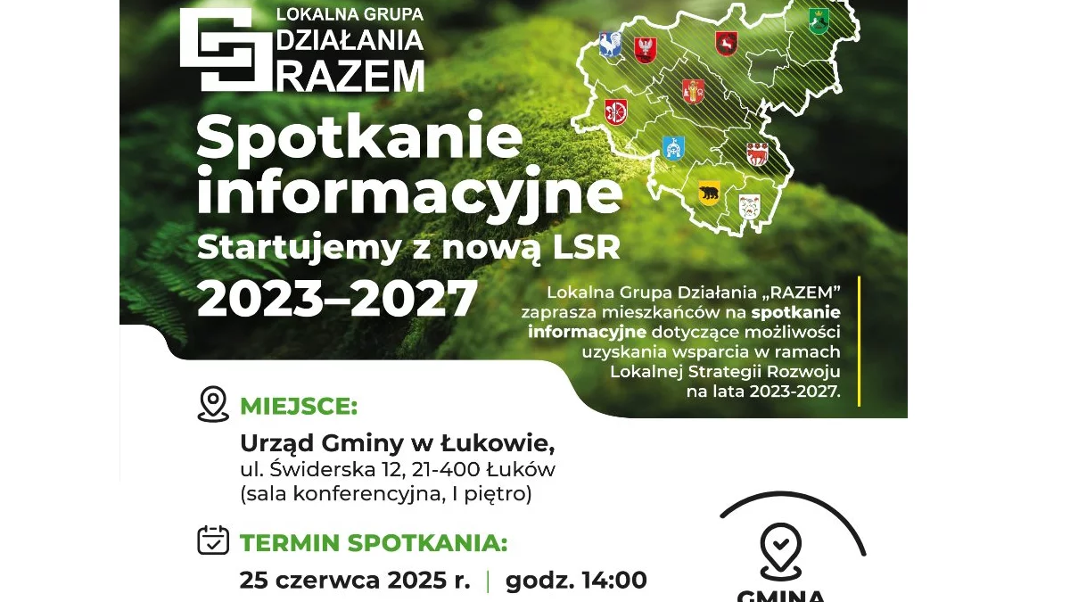 Spotkanie odbędzie się 25 czerwca 2025 r. (środa) o godz. 14:00 w sali konferencyjnej Urzędu Gminy w Łukowie (ul. Świderska 12, I piętro).