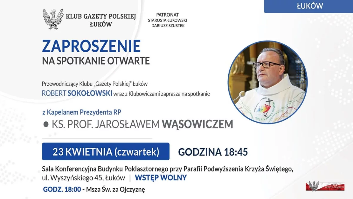 Klub „Gazety Polskiej” w Łukowie zaprasza mieszkańców na spotkanie otwarte, którego gościem będzie kapelan Prezydenta RP, Jarosław Wąsowicz. Wydarzenie zaplanowano na czwartek, 23 kwietnia, o godzinie 18:45 w sali konferencyjnej budynku poklasztornego przy parafii Podwyższenia Krzyża Świętego przy ul. Wyszyńskiego 45.