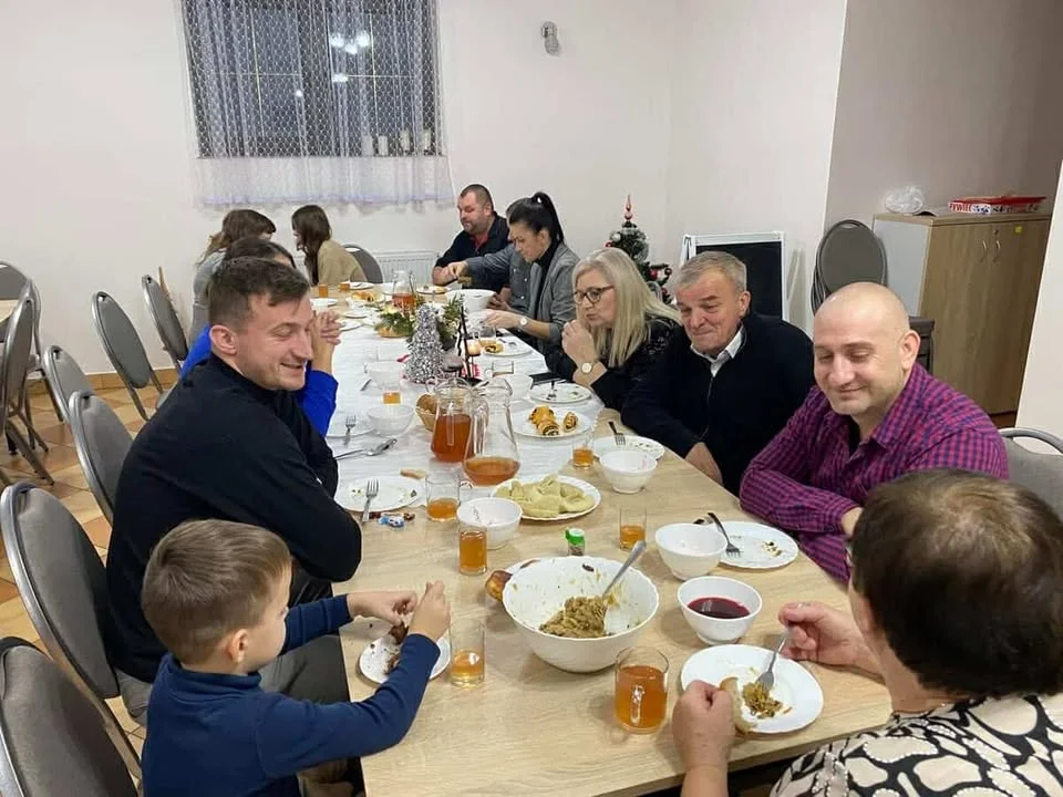 Sąsiedzi mieli okazję złożyć sobie życzenia i podzielić się opłatkiem. KGW przygotowało tradycyjne dania wigilijne, takie jak barszcz czerwony z pasztecikami, pierogi i kapustę wigilijną. Do tego można było skosztować różnych rodzajów ryb, sałatki, kutię oraz placuszki z makiem. Na deser były makowiec i inne ciasta.