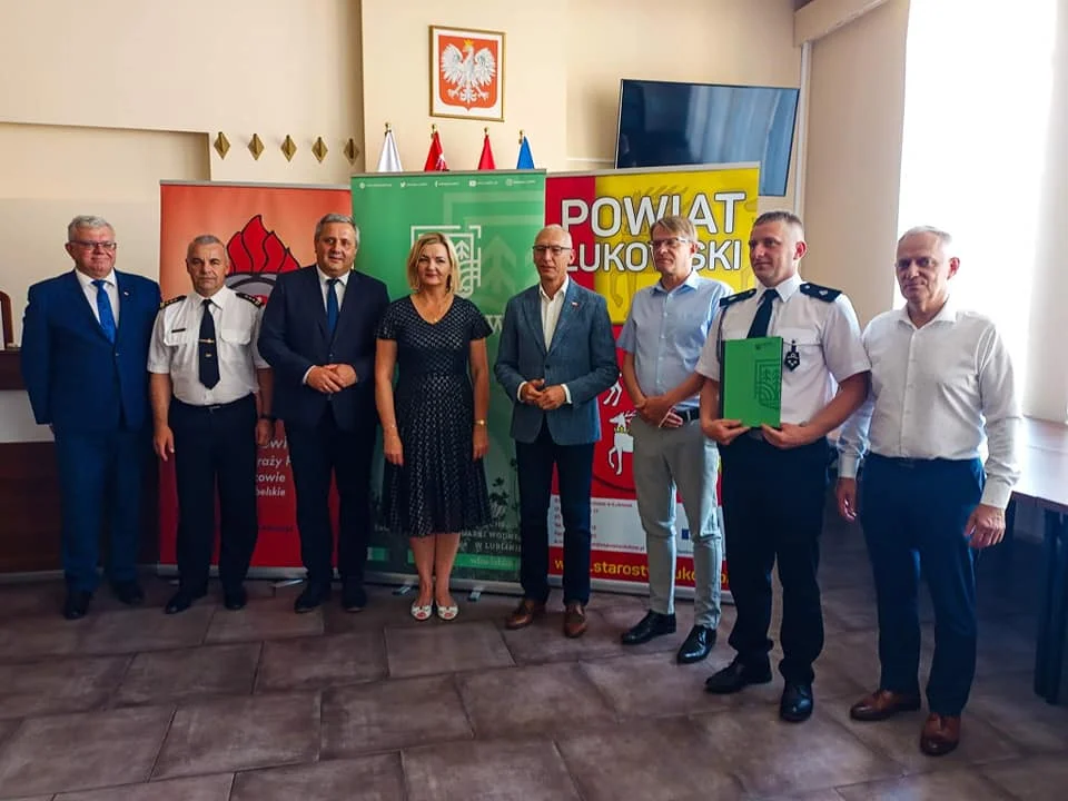 Do Starostwa Powiatowego w Łukowie przybyli także starszy kapitan Paweł Szyszkowski,który złożył meldunek Zastępcy Lubelskiego Komendanta Wojewódzkiego Państwowej Straży Pożarnej starszemu brygadierowi Mirosławowi Buremu oraz Zastępca Komendanta Powiatowego Państwowej Straży Pożarnej w Łukowie kapitan Konrad Turski.