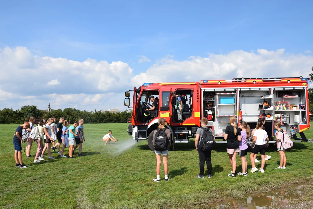 Uczniowie z bliska mogli podziwiać wyposażenie jakim dysponują strażacy, przymierzyć hełm strażacki, a także podlać boisko z armaty wodnej i przez chwilę poczuć się tak, jak strażacy podczas akcji.