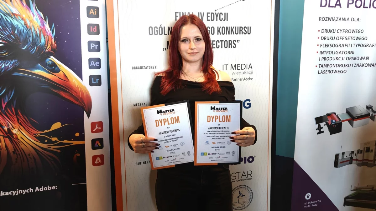 Anastasiia Ferenets została sklasyfikowana w gronie najlepszych młodych twórców grafiki wektorowej w Polsce. Jej prace zostały wysoko ocenione przez ekspertów branżowych, a szczególne uznanie zdobyła realizacja przygotowana na etapie półfinałowym, za którą przyznano wyróżnienie. Zakres konkursu obejmował zaawansowane zagadnienia z obszaru projektowania graficznego, w tym precyzyjne operowanie formą wektorową oraz tworzenie kompozycji spełniających określone wymogi techniczne i użytkowe.