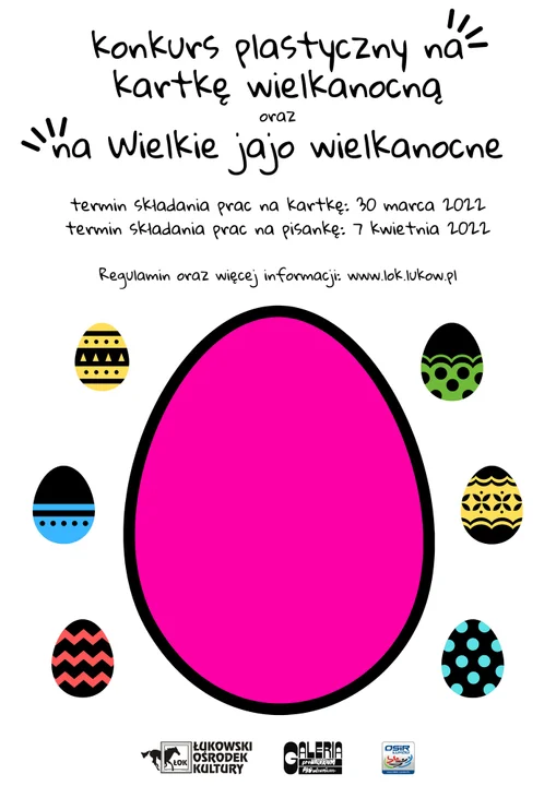 - na Wielkie Jajo Wielkanocne, czyli pisankę - minimum 20 cm wysokości (termin składania prac do 7 kwietnia). Informacje o wynikach oraz najciekawsze prace zostaną opublikowane na stronie internetowej ŁOK i mediach. Pytania należy kierować pod adresem e-mail: konkurs@lok.lukow.pl. regulamin na stronie ŁOK.