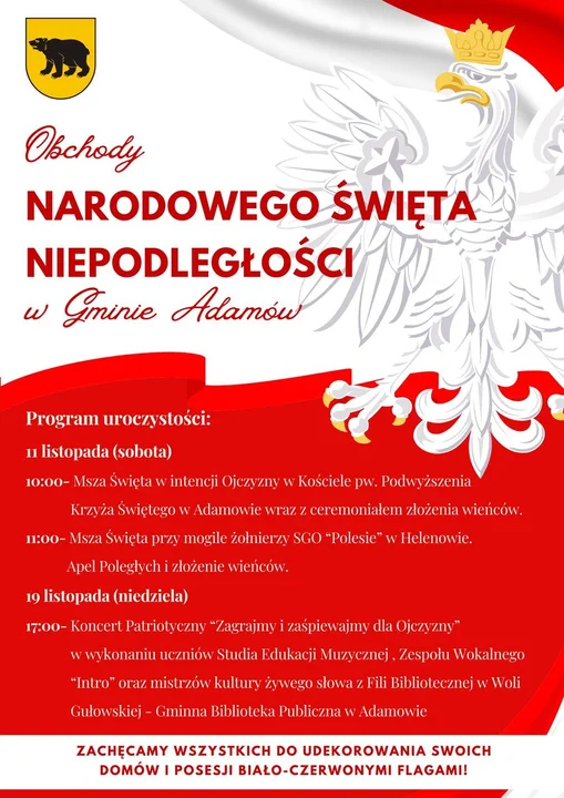 Z kolei w niedzielę 19 listopada o godz.17:00 w Gminnej Bibliotece Publicznej w Adamowie odbędzie się również koncert patriotyczny pod hasłem "Zagrajmy i zaśpiewajmy dla Ojczyzny". Wystąpią na nim utalentowani wokaliści ze Studia Edukacji Muzycznej, zespół wokalny "Intro", oraz recytatorzy z filii bibliotecznej w Woli Gułowskiej. To okazja do wspólnego śpiewania hymnów i utworów patriotycznych.