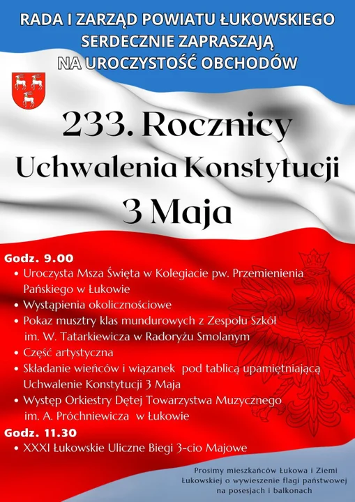 Wzorem lat ubiegłych, oficjalną część uroczystości upamiętniających przypadającą w tym roku 233. rocznicę uchwalenia Konstytucji Trzeciego Maja organizuje Powiat Łukowski. Świętowanie w naszym mieście rozpocznie się o godz. 9.00, gdzie w kościele pw. Przemienienia Pańskiego odbędzie się msza w intencji Ojczyzny.