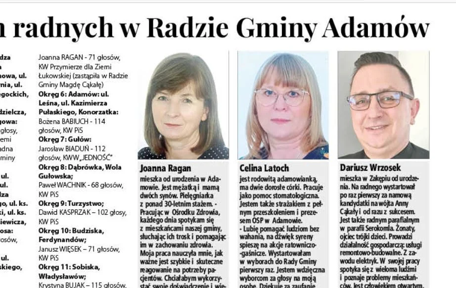 Po raz pierwszy funkcję radnego gminy będą pełnić: Celina Latoch i Joanna Ragan z Adamowa oraz Dariusz Wrzosek z Zakępia.