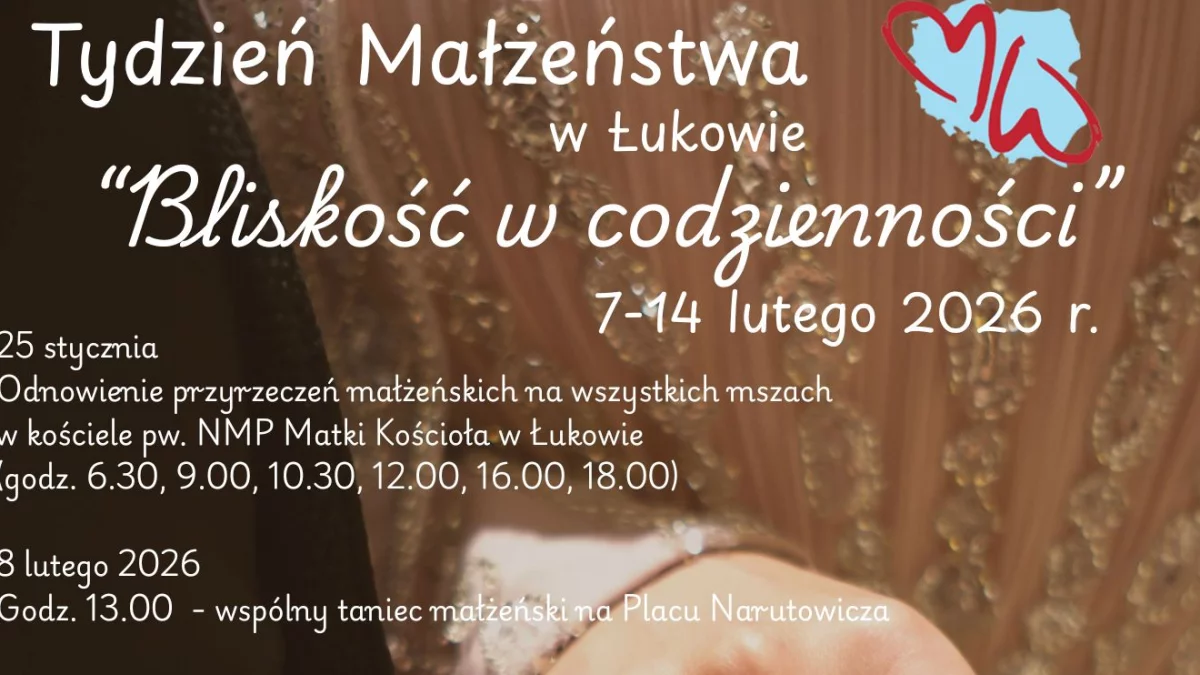W Łukowie po raz kolejny organizowany jest Tydzień Małżeństwa. Inicjatywa skierowana jest do par, które chcą spędzić czas razem i zadbać o swoją relację. Hasłem tegorocznej edycji jest „Bliskość w codzienności”.