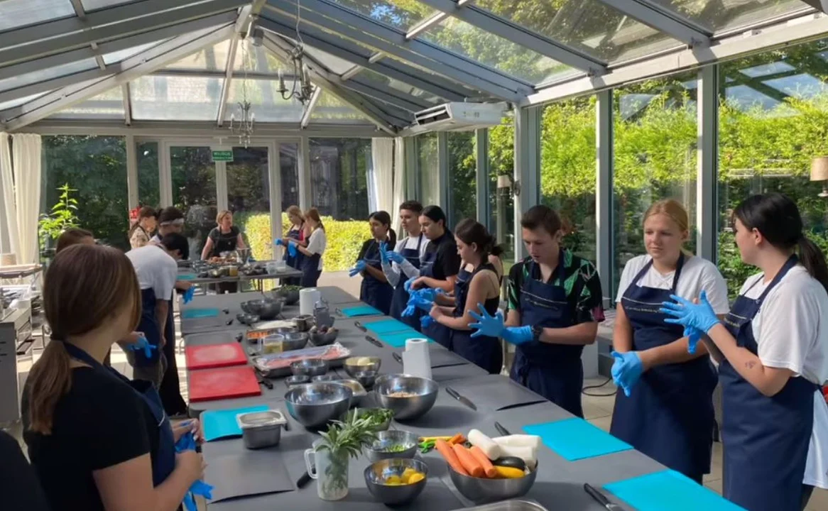 Następnie uczniowie wzięli udział w warsztatach kulinarnych „Potrzeby ogrodne”. W towarzystwie profesjonalnych kucharzy przygotowali m.in. następujące potrawy: pęczak z parmezanem, zrazy z polędwiczki cielęcej wypełnionej farszem z fig i śliwek, gąszcz z szałwii, chipsy z jarmużu, warzywa z sosem winegret. Wszystkim smakował obiad i deser, czyli ptyś z kremem w syropie owocowym.