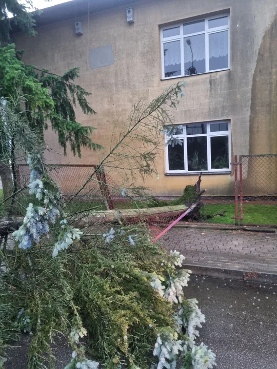 Drzewo, które przewróciło się na teren szkoły, spowodowało uszkodzenia ogrodzenia. W wyniku upadku konstrukcja została naruszona, co stwarzało potencjalne zagrożenie dla uczniów i pracowników szkoły.
