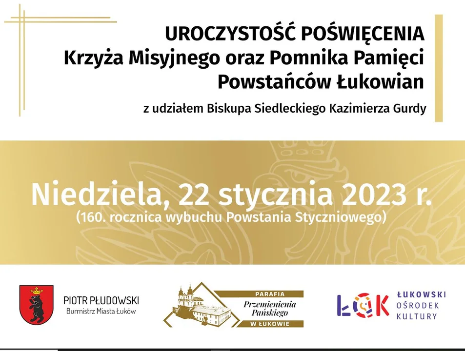 22 stycznia 2023 r. przypada okrągła, bo 160. rocznica wybuchu Powstania Styczniowego. Z tej okazji w naszym mieście odbędą się uroczystości, w trakcie których - oprócz wspomnienia osób walczących o niepodległość naszego kraju - upamiętnione będą też obiekty znajdujące się na Placu Narutowicza w Łukowie: nowy Krzyż Misyjny i pomnik poświęcony Powstańcom Styczniowym.