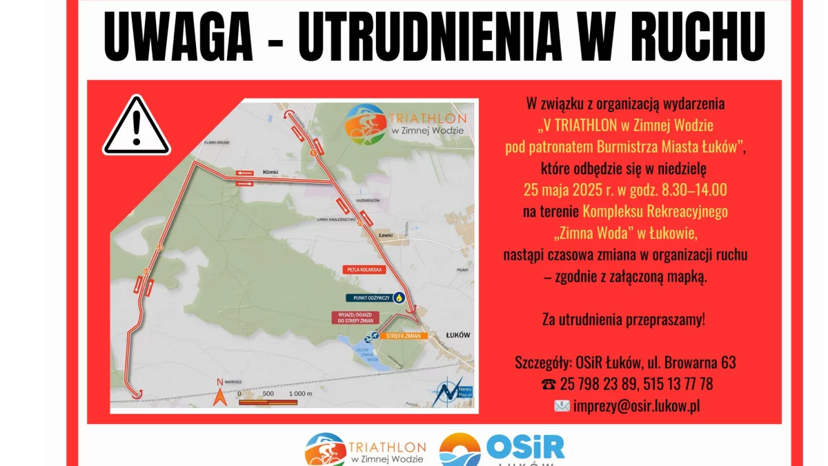 W związku z wydarzeniem nastąpi zmiana organizacji ruchu w okolicy, co może powodować utrudnienia dla kierowców i mieszkańców. Szczegóły dotyczące zmian dostępne są na przygotowanej mapce sytuacyjnej. Organizatorzy przepraszają za wszelkie niedogodności.