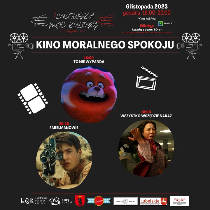 Na początek zapraszamy w poniedziałek 6 listopada na Kino Moralnego Spokoju, czyli specjalne seanse w Kinie Łuków. Wydarzenie bierze udział w programie „Warto być Polakiem", którego organizatorem jest Samorząd Województwa Lubelskiego. Celem programu „Warto być Polakiem" jest pielęgnowanie polskości i wartości patriotycznych przez mieszkańców województwa lubelskiego.
