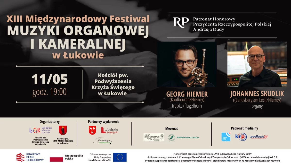 Georg Hiemer, urodzony w 1991 roku w bawarskim Kaufbeuren, należy do młodego pokolenia europejskich trębaczy, którzy łączą solidne wykształcenie z pasją do koncertowania. Absolwent Tyrolskiego Państwowego Konserwatorium oraz klasy mistrzowskiej prof. Ericha Rinnera, ma na koncie międzynarodowe tournée oraz wydaną w 2016 roku płytę solową pt. Friends. W Łukowie zaprezentuje brzmienie zarówno klasycznej trąbki, jak i subtelniejszego flugelhornu.Z kolei Johannes Skudlik to postać o ugruntowanej pozycji w świecie muzyki organowej i chóralnej. Urodzony w Monachium, dorastał w Barcelonie, a jego koncertowa mapa obejmuje prestiżowe katedry, filharmonie i sale koncertowe Europy, USA i Azji. Jako dyrygent współpracował m.in. z Münchener Bach-Chor i Munich Symphony Orchestra. Jego interpretacje łączą precyzję z emocjonalnym ładunkiem, a każdemu koncertowi towarzyszy wyraźna myśl artystyczna.