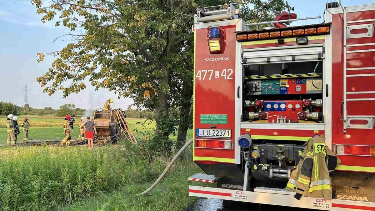 Ogień objął zarówno maszynę rolniczą, jak i ściernisko, na którym pracowała.