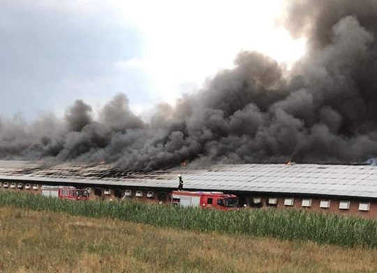- W momencie przybycia zastępów pożarem objęty był cały budynek o wymiarach 145 m na 24 m i wysokości około 7m. Strażacy podawali prądy wody w natarciu na pożar, oraz prądy wody w obronie kurnika znajdującego się obok.