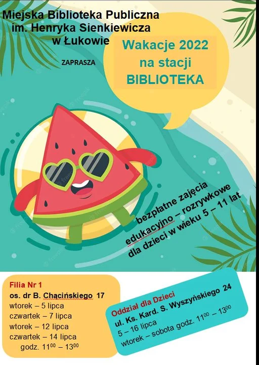 „Wakacje 2022 na stacji Biblioteka” to cykl zajęć, które będą się odbywać w Oddziale dla Dzieci w głównej siedzibie biblioteki na ul. Wyszyńskiego oraz w Filii nr 1 na osiedlu Chącińskiego. Potrwają od 5 do 16 lipca. Młodzi czytelnicy będą mogli spędzać czas w Oddziale dla Dzieci MBP w Łukowie we wtorki i w soboty od godziny 11.00 do 13.00. Filia nr 1 na os. Chącińskiego zaprasza we wtorki i w czwartki w tych samych godzinach.