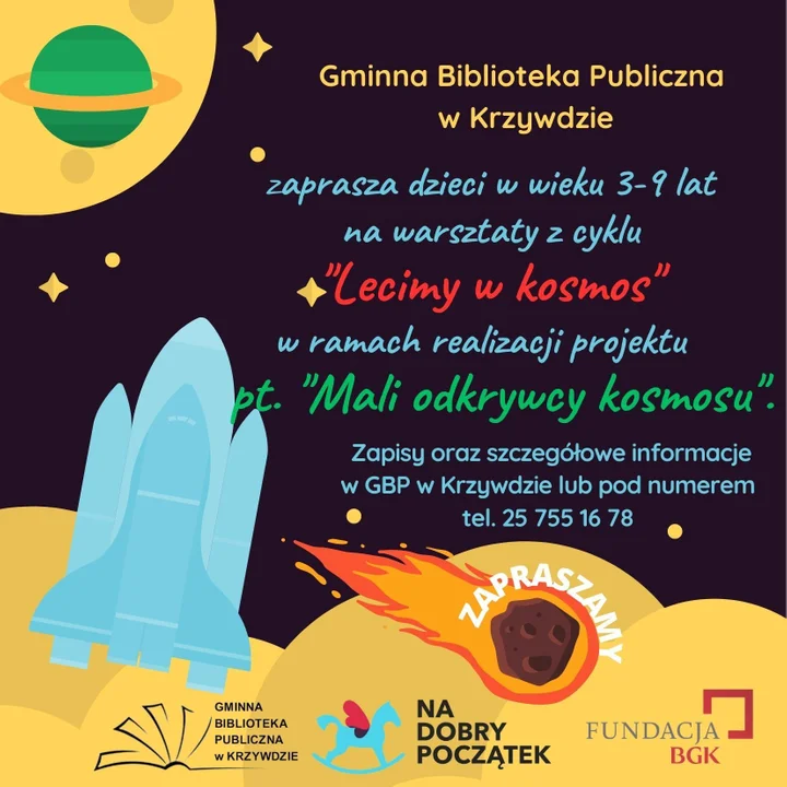 Warsztaty odbędą się w ramach realizacji projektu pt. "Mali odkrywcy kosmosu" w konkursie grantowym "Na dobry początek! XV Edycja" finansowanym przez Fundację BGK im. J.K. Steczkowskiego. w programie warsztatów m.in. konstruowanie statków kosmicznych z klocków Lego, poznanie stroju astronauty, układu słonecznego, wielki wybuch, lunety i teleskopy, zaćmienie słońca.