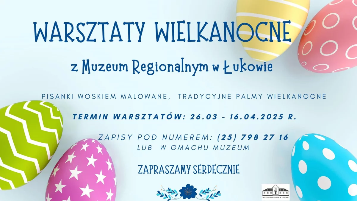 Informacje łukowskieMuzeum Regionalne w Łukowie zaprasza dzieci, młodzież oraz osoby dorosłe do udziału w warsztatach ludowych przygotowanych z okazji zbliżających się Świąt Wielkiej Nocy. Do wyboru będzie można wybrać jeden z dwóch tematów: tworzenie wielkanocnych pisanek lub wykonywanie tradycyjnych zielonych palemek. Terminy: od 26 marca do 16 kwietnia.