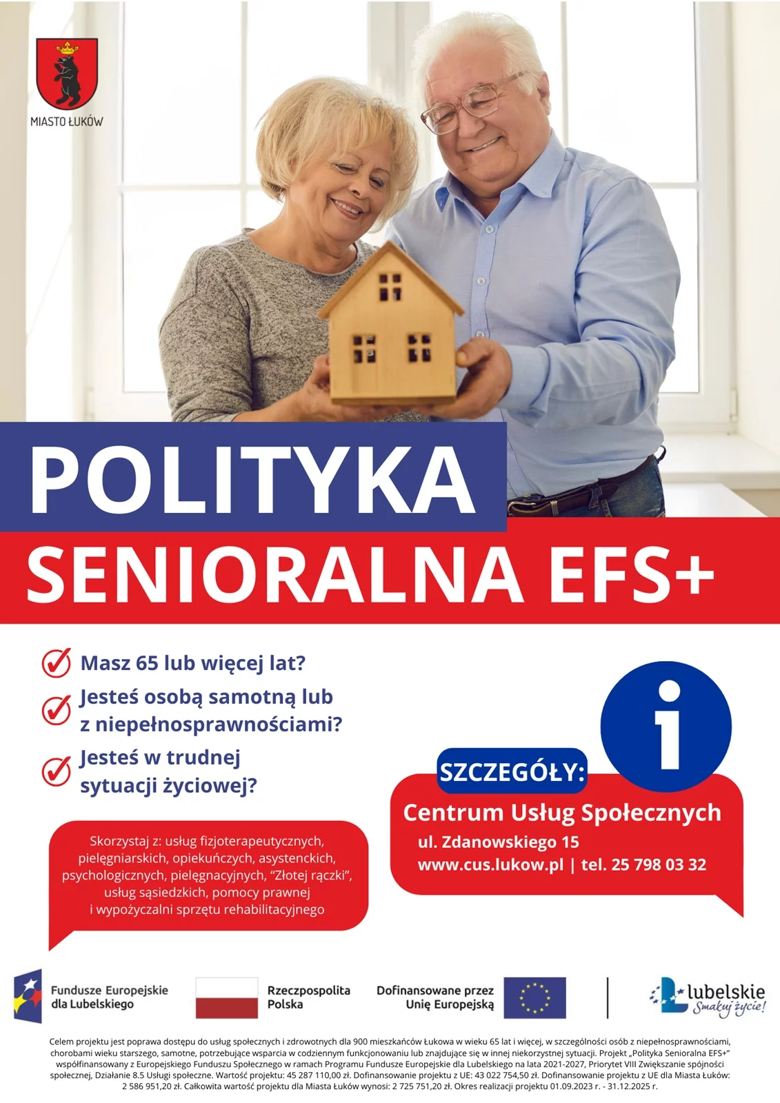 Celem projektu jest poprawa dostępu do usług społecznych i zdrowotnych dla 900 mieszkańców Łukowa w wieku 65 lat i więcej, w szczególności osób z niepełnosprawnościami, chorobami wieku starszego, samotne, potrzebujące wsparcia w codziennym funkcjonowaniu lub znajdujące się w innej niekorzystnej sytuacji.