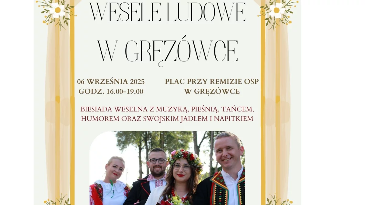 To wyjątkowa okazja, by wspólnie uczestniczyć w biesiadzie weselnej na świeżym powietrzu, ciesząc się muzyką na żywo, pieśnią, tańcem, humorem, a także smakując swojskie jadło i napitki. Przyjdź i spędź z nami niezapomniane chwile w gręzówkowskim plenerze, dopóki pozwoli na to pogoda!