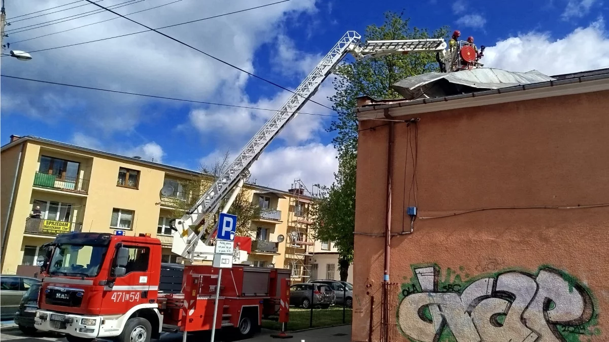 Na miejsce wezwano strażaków, którzy przystąpili do zabezpieczenia uszkodzonego dachu. Przy użyciu podnośnika oraz sprzętu do prac na wysokości przymocowali oderwane elementy poszycia do konstrukcji dachu, wykorzystując wkręty i wkrętarki. Działania te pozwoliły doraźnie zabezpieczyć obiekt i zapobiec dalszemu zrywaniu fragmentów pokrycia.