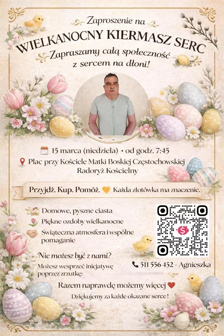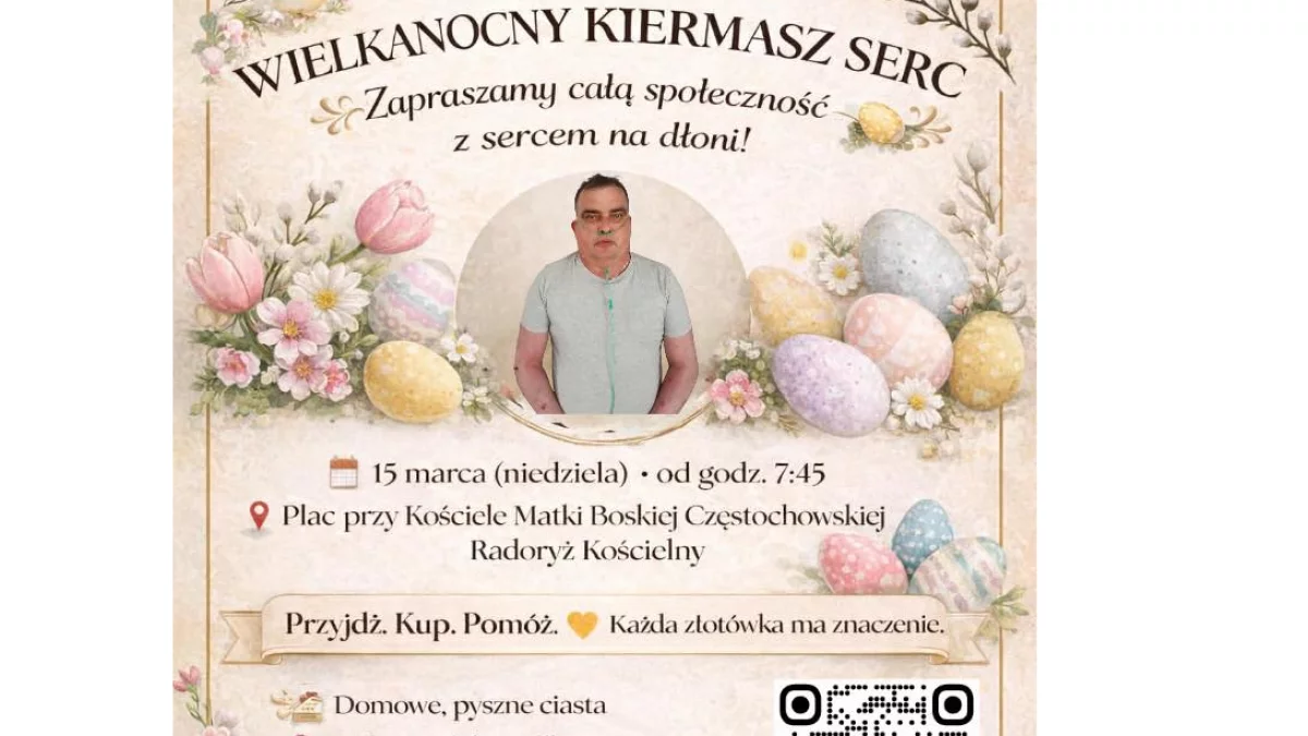 Podczas kiermaszu będzie można kupić domowe ciasta i ozdoby wielkanocne. Mieszkańcy mogą włączyć się w pomoc, przygotowując wypieki lub dekoracje. Jak się włączyć do akcji? Upiecz ciasto i przynieś je na kiermasz. Wykonaj ozdoby wielkanocne. Wesprzyj zakup potrzebnych produktów. Przyjdź na kiermasz, kup i pomóż – każda złotówka ma znaczenie.