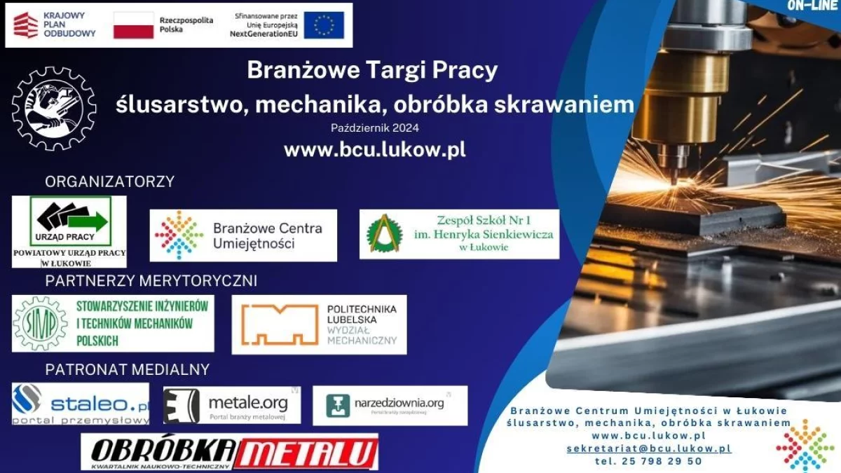 Już 20 października ruszają WIRTUALNE TARGI PRACY - ślusarstwo, mechanika, obróbka skrawaniem. Na stronie BCU (www.bcu.lukow.pl) https://bcu.lukow.pl/zostaną zamieszczone profile czołowych pracodawców branży metalowej.