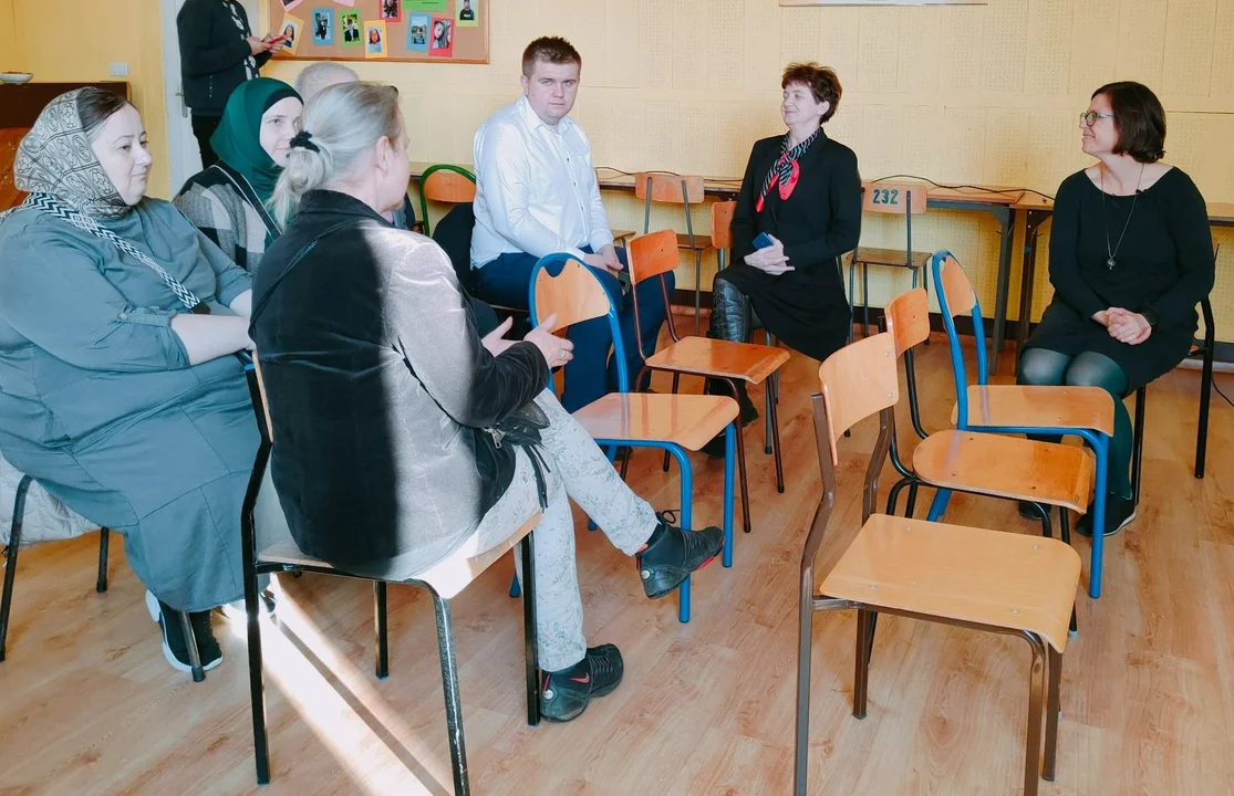 Miejsce na konferencję nie mogło być inne. To właśnie z tą szkołą pracujemy od wielu lat i współpraca ta układa się naprawdę wzorcowo – podkreśla Ewa Kozdraj, prezeska Stowarzyszenia. W trakcie spotkania przedstawiona została idea projektu realizowanego w kooperacji z Gminną Biblioteką i Domem Kultury w Łaziskach oraz norweską spółdzielnią socjalną Vintage Baby. Jednym z głównych zamierzeń projektu jest wsparcie kobiet i dzieci z doświadczeniem uchodźstwa oraz kobiet z terenów wiejskich. Powstał kobiecy kolektyw „Włączone”, który wspólnie pracuje nad produktem. Będzie on ręcznie wykonywany przez członkinie kolektywu, a dochód ze sprzedaży przeznaczony zostanie na wspólnie wybrany cel społeczny. Wcześniej uczestniczki projektu wzięły udział w warsztatach diagnozująco-integrujących, treningu WenDo, oraz spotkaniach twórczych, które pomogły wypracować pomysł produktu oraz jego promocję. Dodatkowo część zespołu uczestniczyła w wizycie studyjnej przyglądając się specyfice działania partnerskiej organizacji.