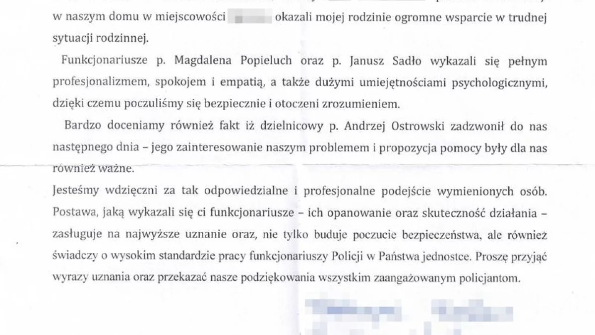 W liście skierowanym do Komendanta Powiatowego Policji w Łukowie, rodzina oprócz podziękowań stwierdziła między innymi, że „… asp. Magdalena Popieluch i asp. szt. Andrzej Ostrowski wykazali się pełnym profesjonalizmem, spokojem i empatią, a także dużymi umiejętnościami psychologicznymi … Ich opanowanie oraz skuteczność działania – zasługują na najwyższe uznanie oraz nie tylko budują poczucie bezpieczeństwa, ale również świadczą o wysokim standardzie pracy funkcjonariuszy Policji …”.