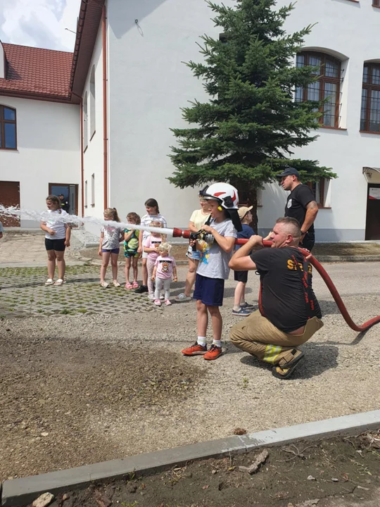 Nie była to zwykła pogadanka o bezpieczeństwie. Mali uczestnicy mieli okazję zobaczyć z bliska wóz strażacki, wejść do środka, przymierzyć strażacki hełm, a nawet... lać wodę z prawdziwego węża strażackiego!