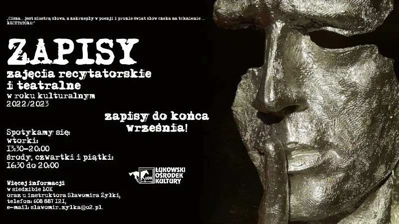 Działania teatralne i zajęcia „kultury żywego słowa” czekają w Łukowskim Ośrodku Kultury na kreatywną dziatwę, młodzież i dorosłych. Miejmy nadzieję, że nowy rok kulturalny okaże się łaskawszy, jednak mimo pandemicznych przeszkód udało się stworzyć recytatorom wiele ciekawych prezentacji na żywo i on-line. Były one wielokrotnie nagradzane na konkursach i przeglądach różnego szczebla, z ogólnopolskimi włącznie. Poprzedni rok recytatorski zakończyliśmy wydarzeniem „SŁOWA... KTÓRE LECZĄ popandemiczne słowowobrzmienia!” Mamy nadzieję, że relacja on-line z tego wydarzenia www.youtube.com/watch?v=mObqSQ4VX6U dobrze promuje i rekomenduje tę formę działalności Łukowskiego Ośrodka Kultury.