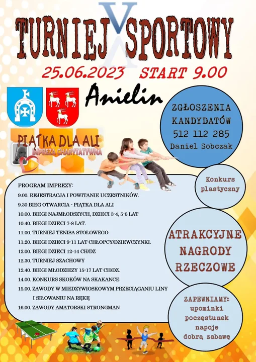Oprócz 5-kilometrowego "Biegu otwarcia" rywalizacja biegaczy będzie się odbywać, w zależności od wieku, na dystansach od 60 do 1000 metrów. Tegoroczny Turniej Sportowy w Anielinie odbędzie się 25 czerwca, ale zapisy uczestników zakończą się tydzień wcześniej. Chętni mogą się zgłaszać telefonicznie pod numer tel.: 512 112 285. Do udziału w zawodach i wsparcia Alicji zachęcają Gmina Krzywda i Powiat Łukowski.