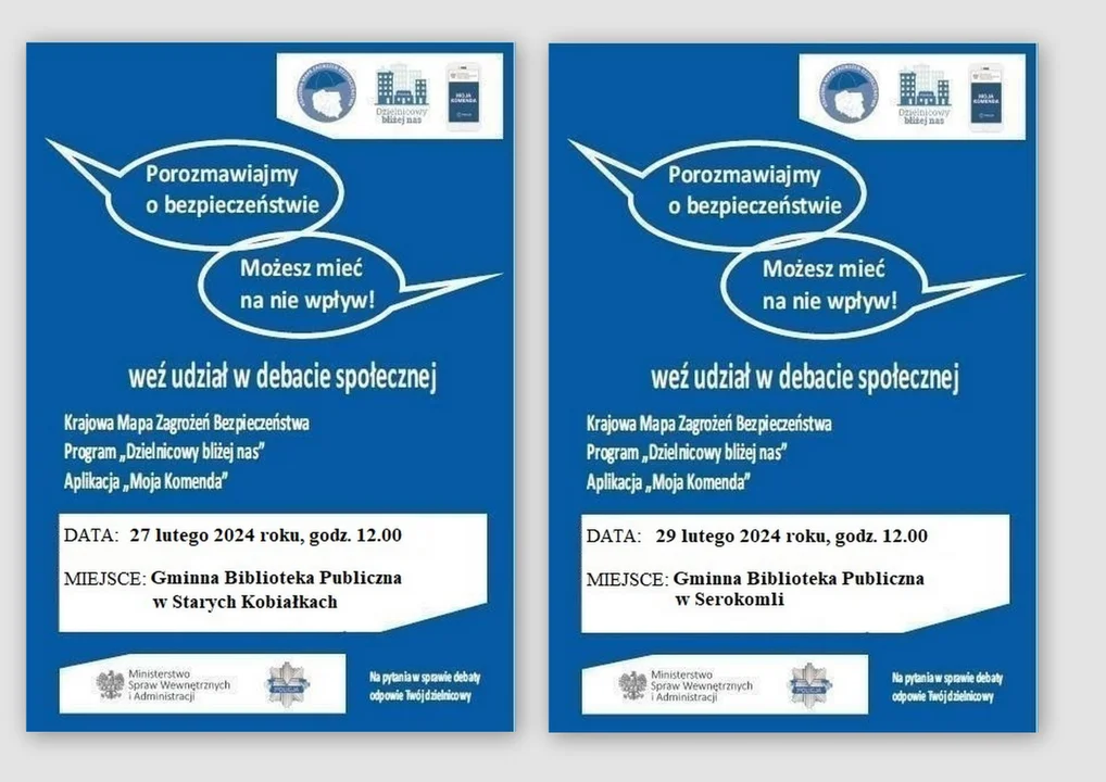- Realizując jedno z priorytetowych zadań naszej formacji, jakim jest zacieśnianie współpracy ze społecznością lokalną, chcielibyśmy ponownie zaprosić Państwa do udziału w kolejnych - ewaluacyjnych spotkaniach w ramach cyklu debat społecznych. Już 27 lutego 2024 roku o godzinie 12.00 w Gminnej Bibliotece Publicznej w Starych Kobiałkach i 29 lutego 2024 roku o godzinie 12.00 w Gminnej Bibliotece Publicznej w Serokomli, policjanci, strażacy i przedstawiciele samorządu będą między innymi oczekiwali na spostrzeżenia, uwagi i sugestie mieszkańców naszego regionu, dotyczące ich bezpieczeństwa. Oprócz tych zagadnień poinformują również o stanie realizacji wniosków przekazanych podczas debat, które odbyły się w Starych Kobiałkach i Serokomli w ubiegłym roku – informuje Marcin Józwik, oficer prasowy Komendy Policji w Łukowie.