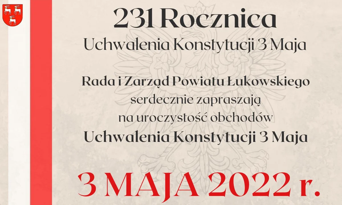 Organizatorzy proszą osoby i instytucje, które w dniu 3 maja chcą złożyć wieńce pod tablicą upamiętniającą uchwalenie Konstytucji 3 Maja, aby w terminie do 29 kwietnia poinformowały o tym pracowników Wydziału Promocji, Rozwoju i Polityki Społecznej Starostwa Powiatowego w Łukowie, ul. Czerwonego Krzyża 4 pok. nr. 14, tel. 25 798 22 03 wew. 171, e-mail: promocja@starostwolukow.pl.