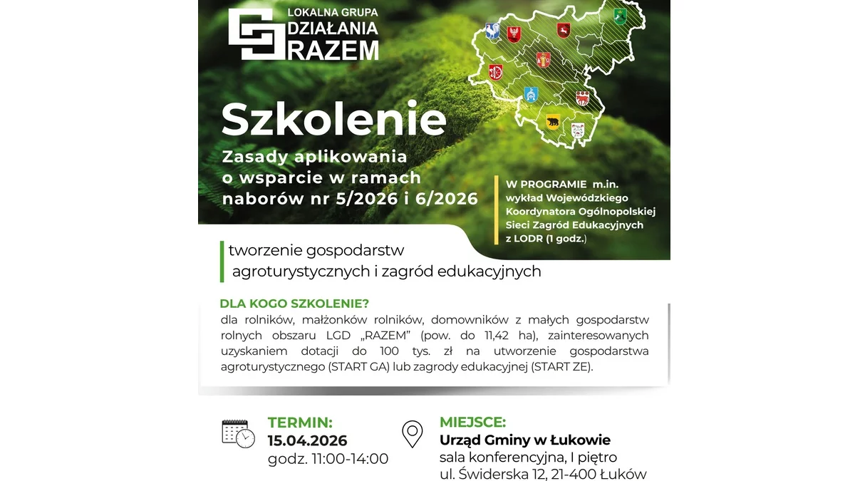 Szkolenie skierowane jest do rolników, małżonków rolników, domowników z małych gospodarstw rolnych obszaru LGD „RAZEM” (do 11,42 ha), zainteresowanych uzyskaniem dotacji do 100 tys. zł na utworzenie gospodarstwa agroturystycznego (START GA) lub zagrody edukacyjnej (START ZE).