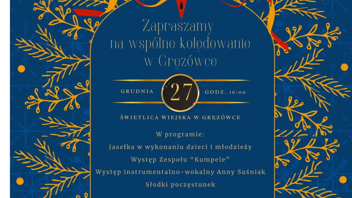 W programie: jasełka w wykonaniu dzieci i młodzieży, występ Zespołu "Kumpele" oraz koncert instrumentalno-wokalny Anny Suśniak. Na uczestników czekać będzie również słodki poczęstunek. Spotkanie będzie okazją do wspólnego śpiewania kolęd i przedłużenia świątecznej atmosfery.