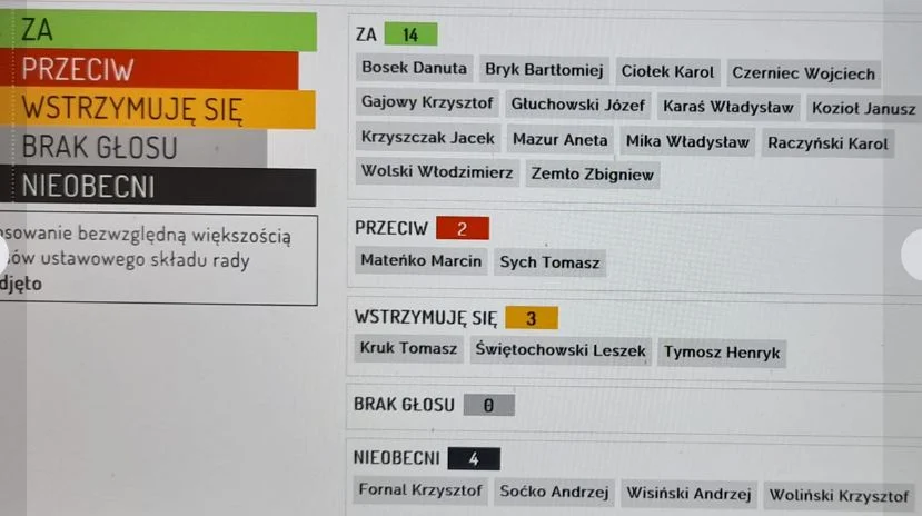 14 radnych głosowało za przyznaniem a dwóch radnych było przeciw. Byli to Tomasz Sych i Marcin Mateńko, którzy nie szczędzili słow krytyki wobec zarządu i nie podzielali optymizmu wobec władzy jak reszta radnych.