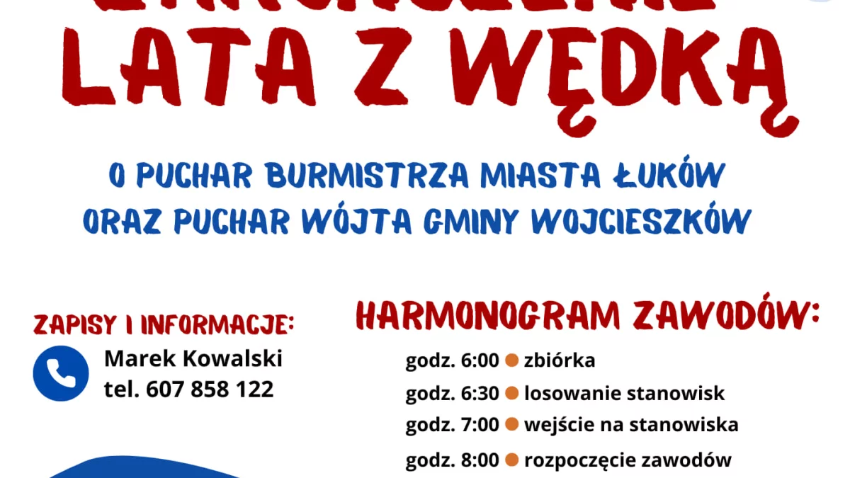- Zapraszamy chętnych wędkarzy (nawet niezrzeszonych w PZW) na zawody „Zakończenie wakacji z wędką pod honorowym patronatem burmistrza Piotra Płudowskiego - Burmistrza Miasta Łuków i wójta Gminy Wojcieszków Marcina Kurka.