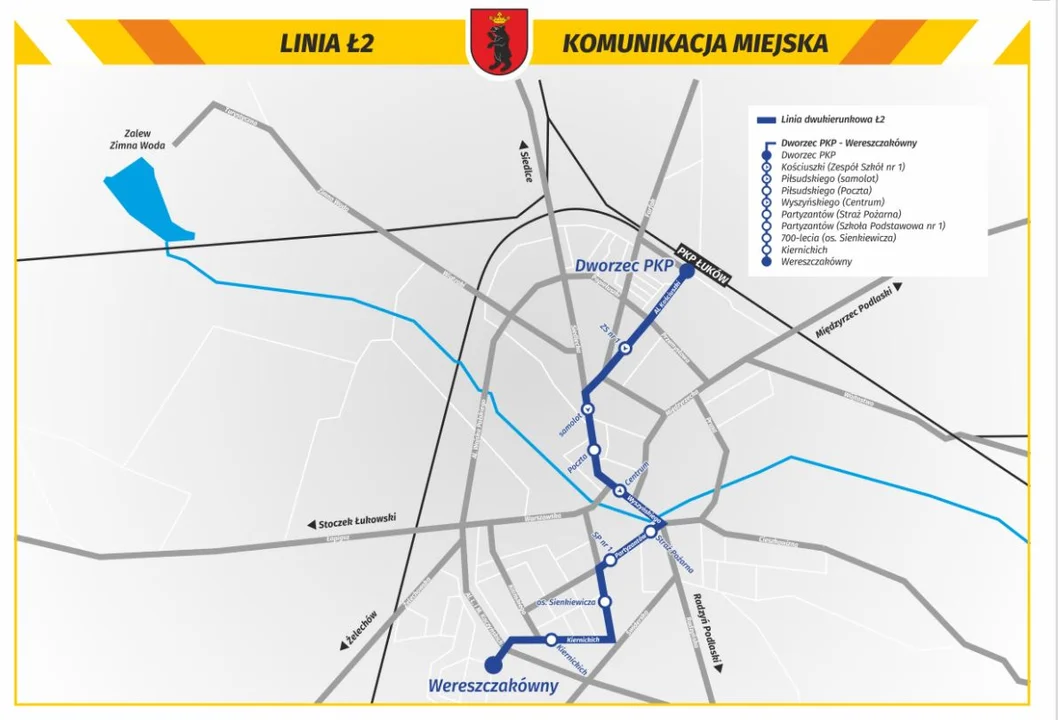 Pierwszy kurs z ul. Wereszczakówny w kierunku Dworca PKP zaplanowano o godz. 5:00. Ostatni autobus będzie natomiast odjeżdżać z Dworca PKP o godz. 20:45. Linia Ł2 w dalszym ciągu kursować będzie od poniedziałku do piątku. Usługę realizuje PKS w Łukowie S.A.