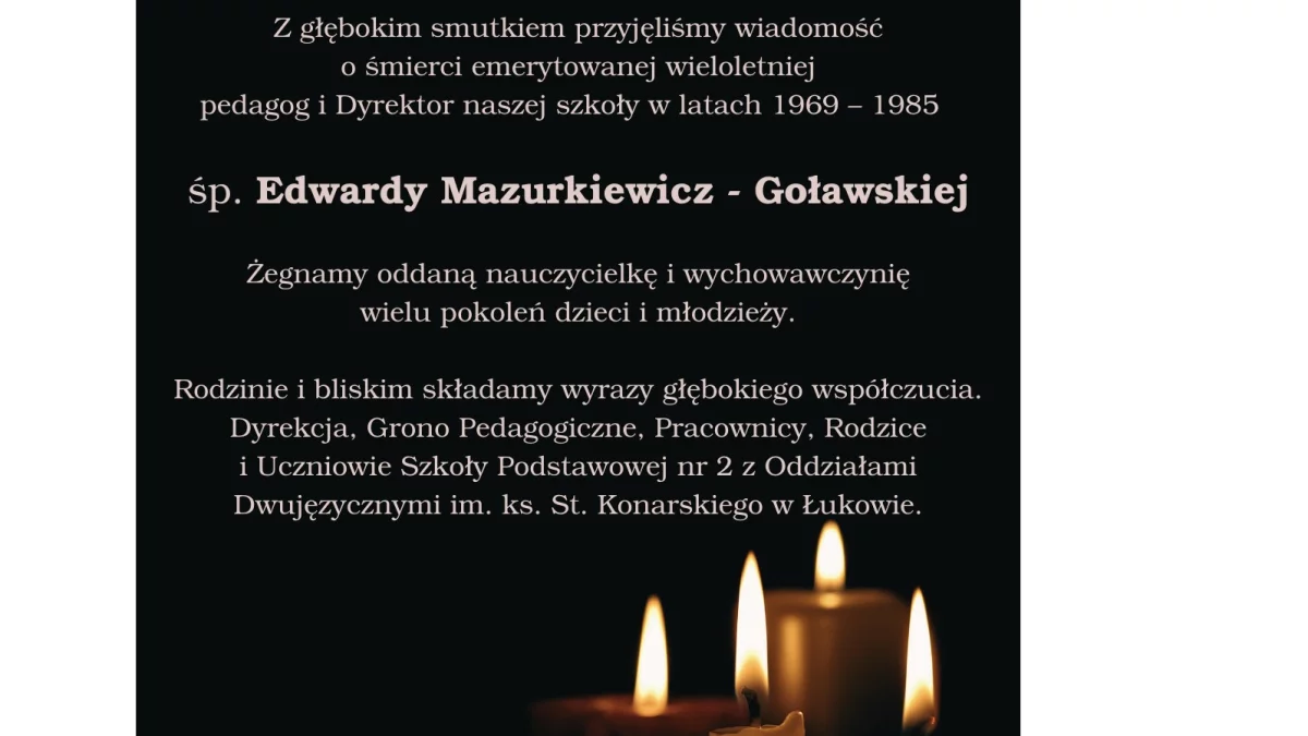 „Składam szczere wyrazy współczucia Rodzinie i Bliskim zmarłej Pani Dyrektor. Była osobą, która od razu robiła dobre wrażenie - życzliwa, zaangażowana, z sercem dla szkoły i ludzi. Miałam zaszczyt Ją znać. Niech spoczywa w pokoju”