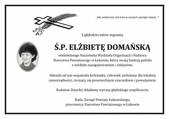 Zmarła Elżbieta Domańska, pracowniczka Starostwa Powiatowego w Łukowie. Przez wiele lat pełniła funkcję Naczelnika Wydziału Organizacji i Nadzoru Starostwa Powiatowego w Łukowie.