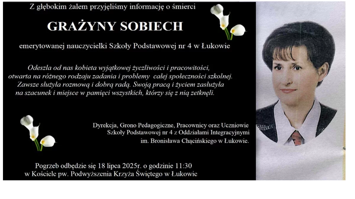 "Z głębokim żalem przyjęliśmy informację o śmierci GRAŻYNY SOBIECH, emerytowanej nauczycielki Szkoły Podstawowej nr 4 w Łukowie. Odeszła od nas kobieta wyjątkowej życzliwości i pracowitości, otwarta na różnego rodzaju zadania i problemy całej społeczności szkolnej. Zawsze służyła rozmową i dobrą radą. Swoją pracą i życiem zasłużyła na szacunek i miejsce w pamięci wszystkich, którzy się z nią zetknęli." W imieniu społeczności szkolnej podpisali się: Dyrekcja, Grono Pedagogiczne, Pracownicy oraz Uczniowie Szkoły Podstawowej nr 4 z Oddziałami Integracyjnymi im. Bronisława Chącińskiego w Łukowie.