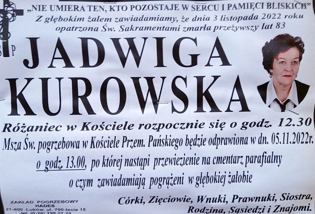 Uroczystości pogrzebowe śp. Jadwigi Kurowskiej zaplanowano na sobotę 5 listopada w Łukowie. Jadwiga Kurowska uczyła się w Liceum Pedagogicznym w Leśnej Podlaskiej. W 1959 r. podjęła pracę w Szkole Podstawowej w Domaszewnicy, pracowała także w Szkole Podstawowej w Jakuszach, w roku 1977 przeniosła się z mężem nauczycielem do Zespołu Szkół w Gołąbkach. Ukończyła w Instytucie Kształcenia Nauczycieli w Warszawie wyższe studia zawodowe w zakresie nauczania początkowego. W 1992 r. nagle zmarł jej ukochany mąż. Po tym przeszła na emeryturę i przeprowadziła się do Łukowa. Przez kolejne 5 lat pracowała w niepełnym wymiarze godzin w Gołąbkach. Łącznie zawód nauczyciela wykonywała przez blisko 40 lat. Dała się poznać jako wspaniała i ciepła osoba. Zawsze na pierwszym miejscu stawiała dobre relacje z uczniami, tworzyła przyjazną atmosferę, dbała o wszechstronny rozwój dziecka.