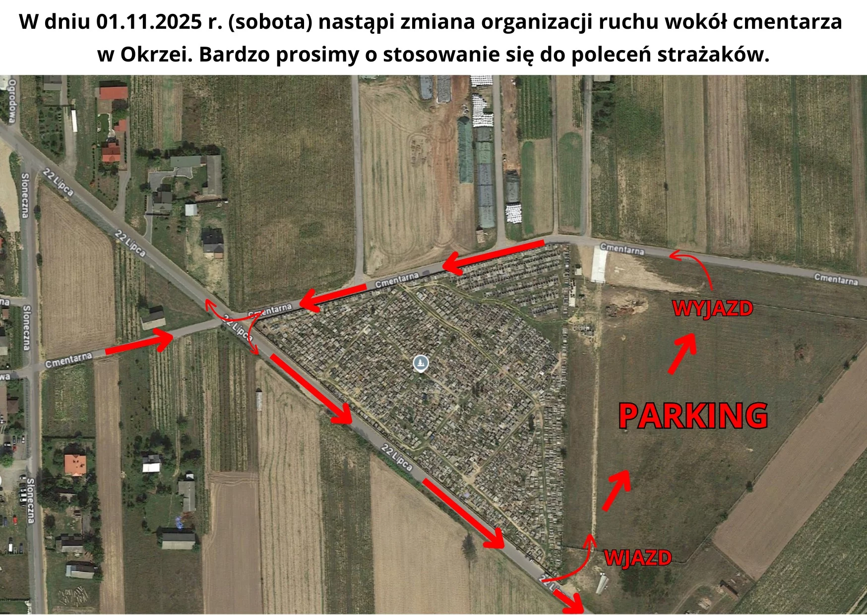 Jak poinformowała jednostka OSP Okrzeja - ruch wokół cmentarza będzie jednokierunkowy, a parkowanie możliwe wyłącznie w wyznaczonych miejscach.