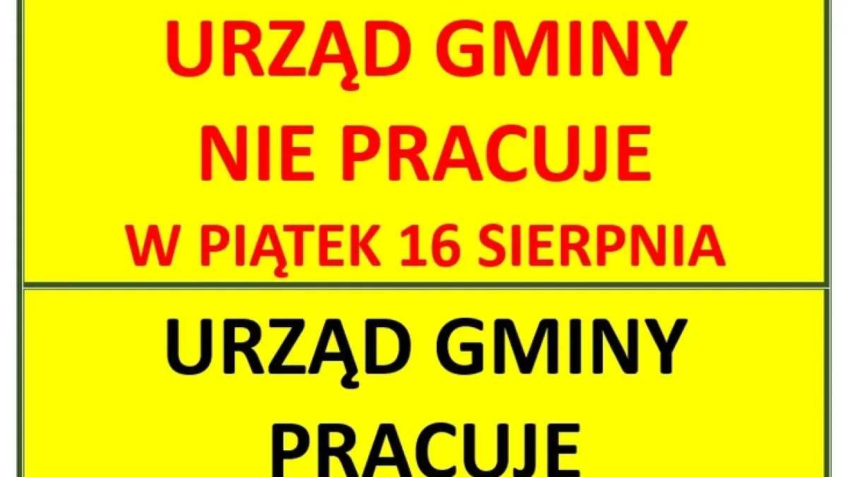 Urząd Gminy nie pracuje 16 sierpnia (piątek), natomiast będzie czynny w dniu 24 sierpnia (sobota), dotyczy to także GOPS i GZOSiP.