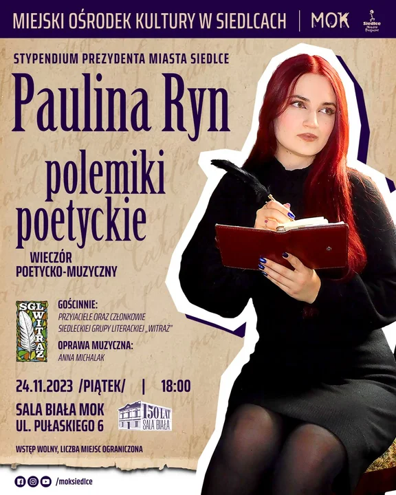 Kultura24 listopada o 18.00 w Sali Białej MOK odbędzie się stypendialny wieczór poetycki Pauliny Ryn pt. ,,Polemiki poetyckie".