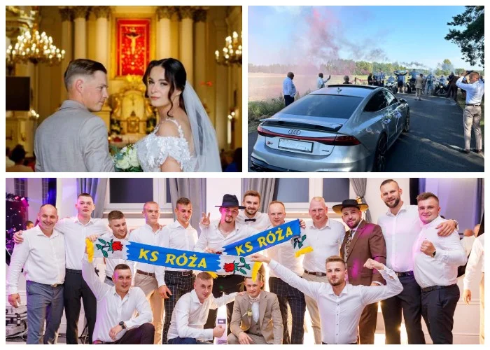 Młodzi w drodze na uroczystości napotkali "bramę". Przedstawiciele klubu odpalili flary. Były życzenia, a w rewanżu napoje z procentami. Artur i Dominika otrzymali piłkę z podpisami zawodników oraz kopertę z gratulacjami.
