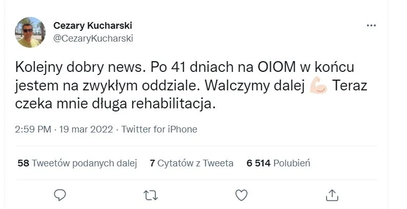 19 marca wrzucił bardzo pomyślne info: Kolejny dobry news. Po 41 dniach na OIOM w końcu jestem na zwykłym oddziale. Walczymy dalej 💪🏻 Teraz czeka mnie długa rehabilitacja.
