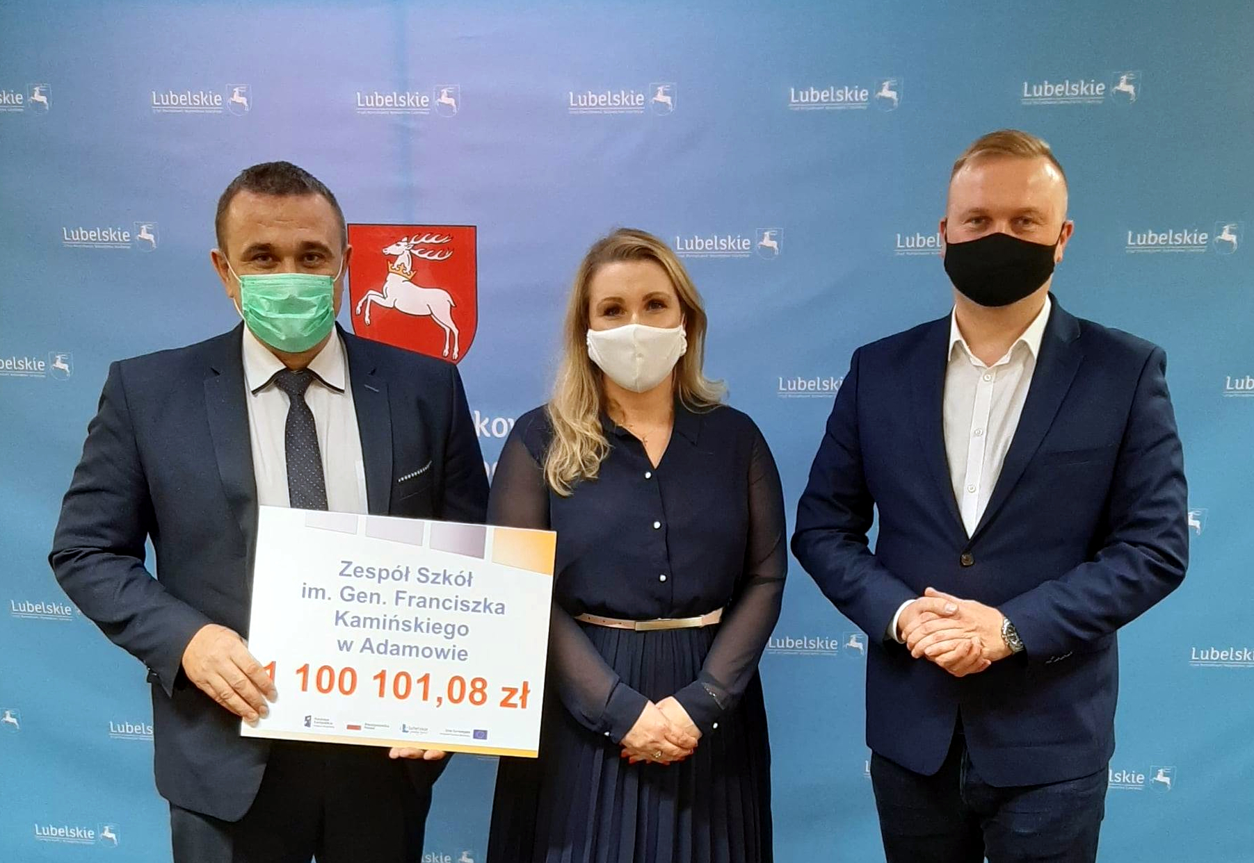 1 grudnia dyrektor Zespołu Szkół im. Gen. Franciszka Kamińskiego w Adamowie Jarosław Szczepaniak w obecności wójta Karola Ponikowskiego, z rąk sekretarz Województwa Lubelskiego Róży Dyrka oraz dyrektor Katarzyny Tokarczuk odebrał voucher na kwotę 1,1 mln zł. w ramach projektu „Dobry START na rynku pracy” dofinansowanego z Regionalnego Programu Operacyjnego Województwa Lubelskiego na lata 2014-2020.